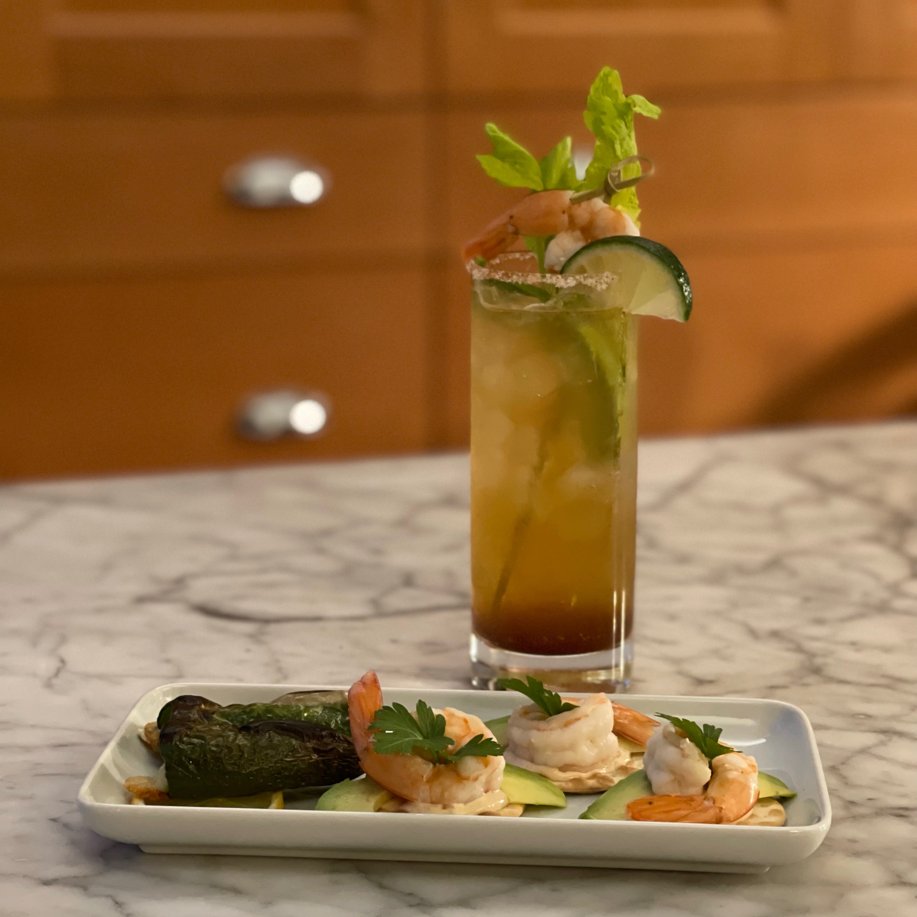 I served my beverage with some tasty appetizers, shrimp cocktail canapés and some jalapeno poppers!