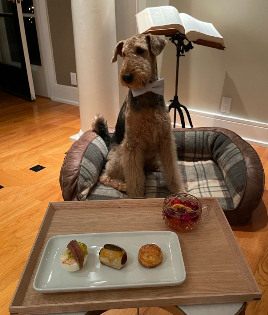 This punch combines fresh fruity flavors, a little kick of ginger, and bubbles courtesy of dry Prosecco. I have kicked into full party mode and am serving this thirst quenching cocktail with not one, not two, but three hors d’oeuvres: Anchovy Deviled Eggs, Port Glazed Pigs in a Blanket, and Gougères.