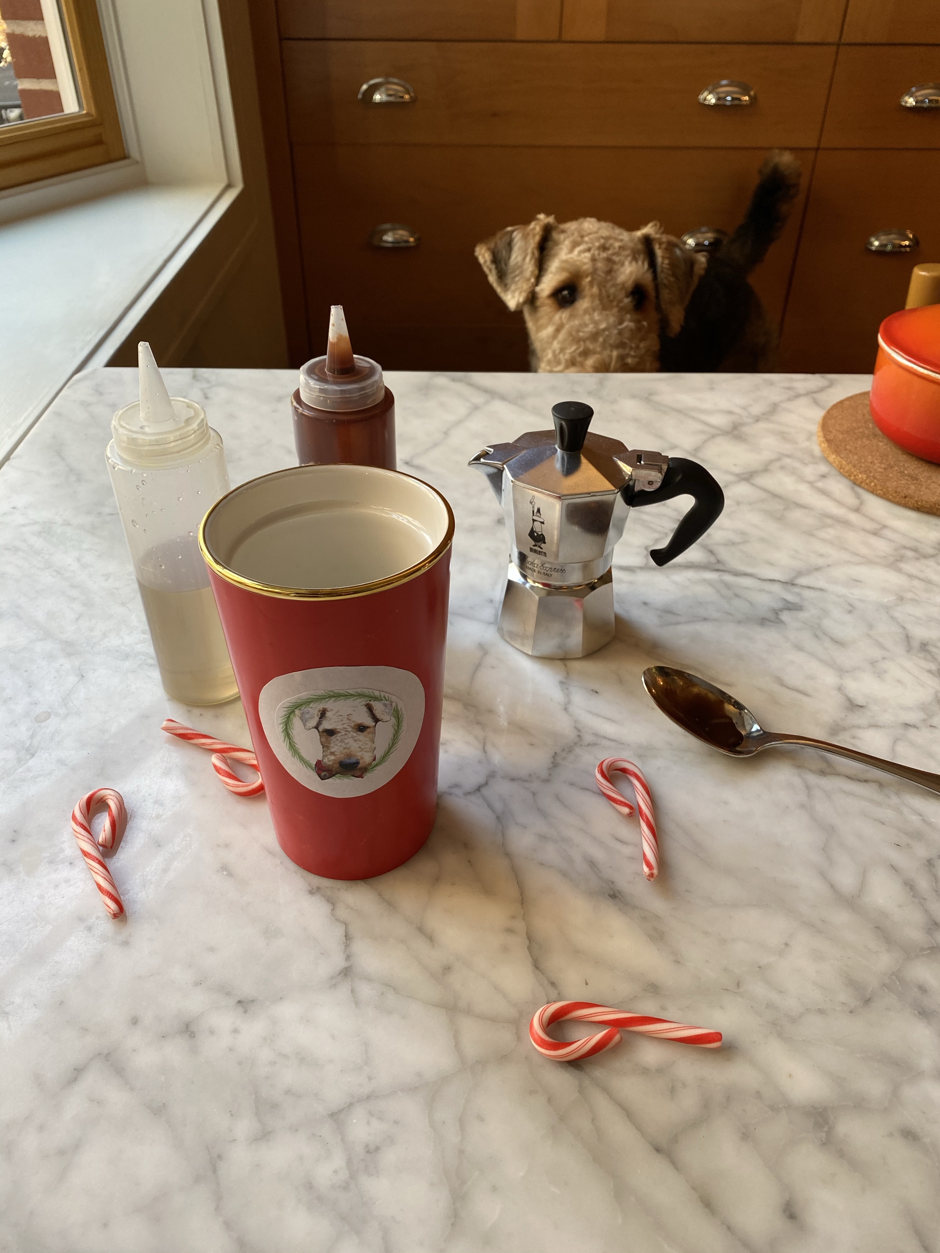 - In a mug, add your chocolate syrup and peppermint syrup to taste. Pour your espresso shot in and give it a quick stir. Add steamed milk. Top with whipped cream and garnish with peppermint candy cane pieces. Enjoy!