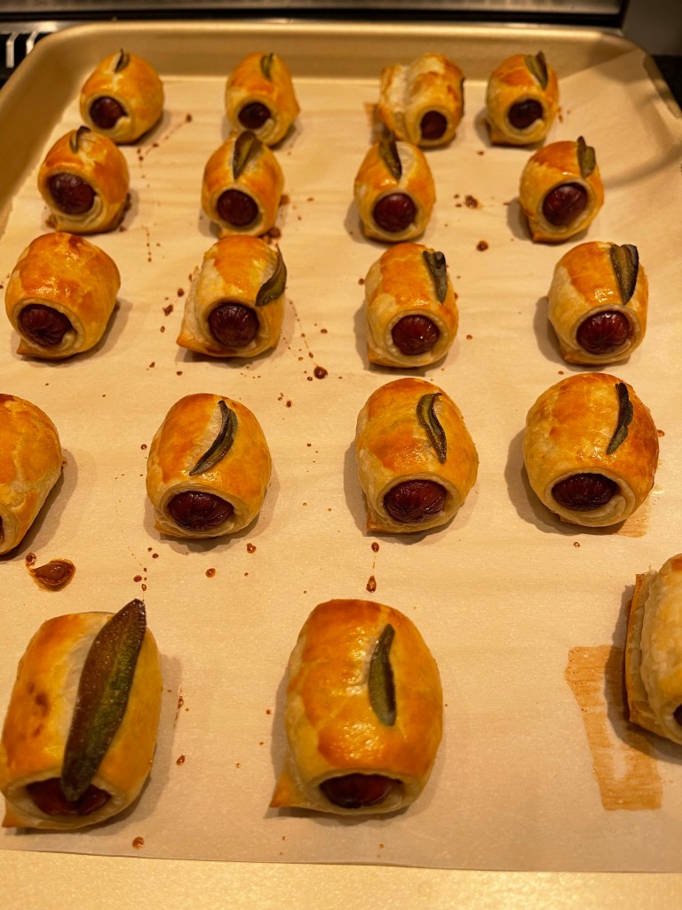 - Egg wash each sausage roll and add a small sage leaf on top.