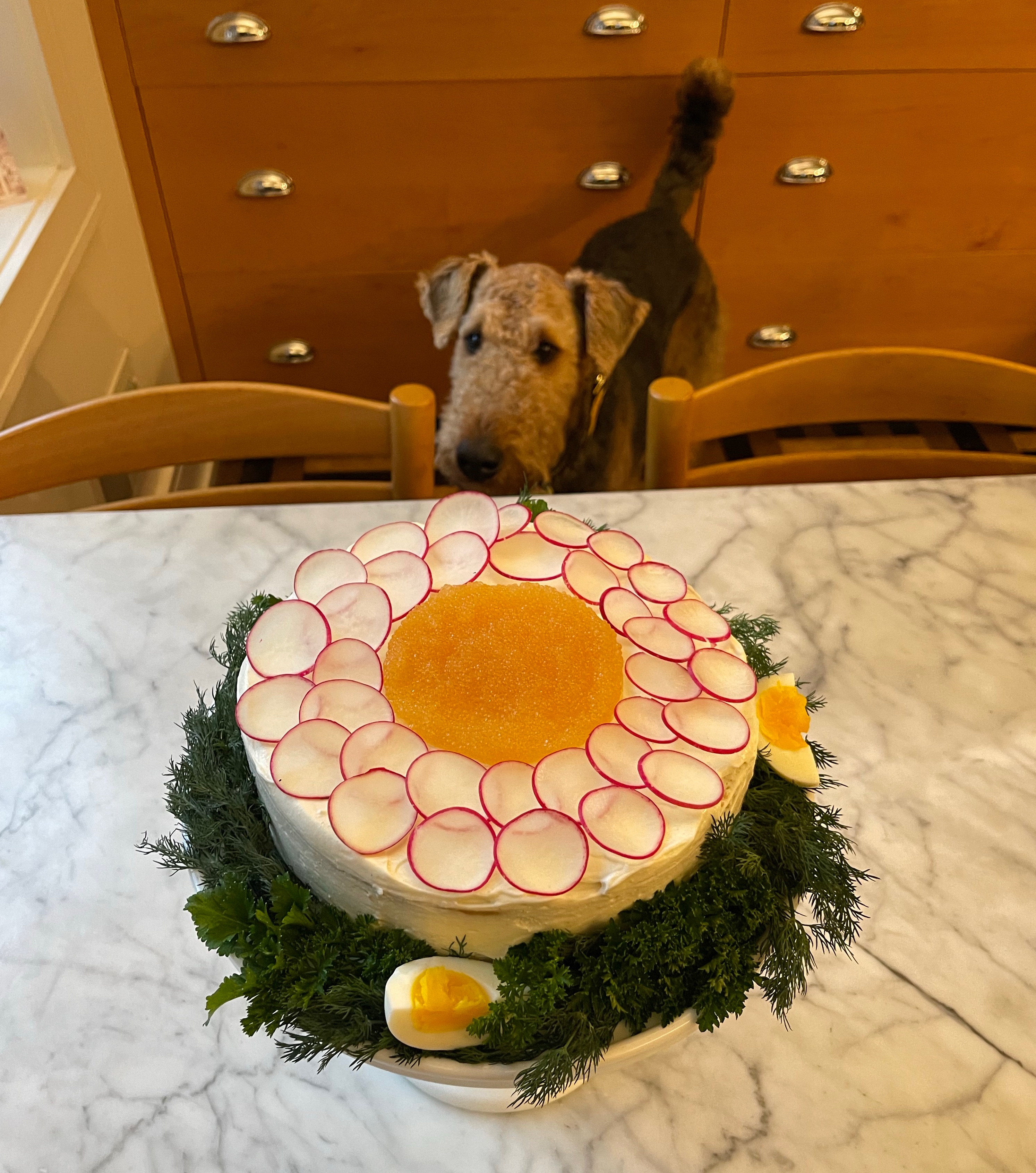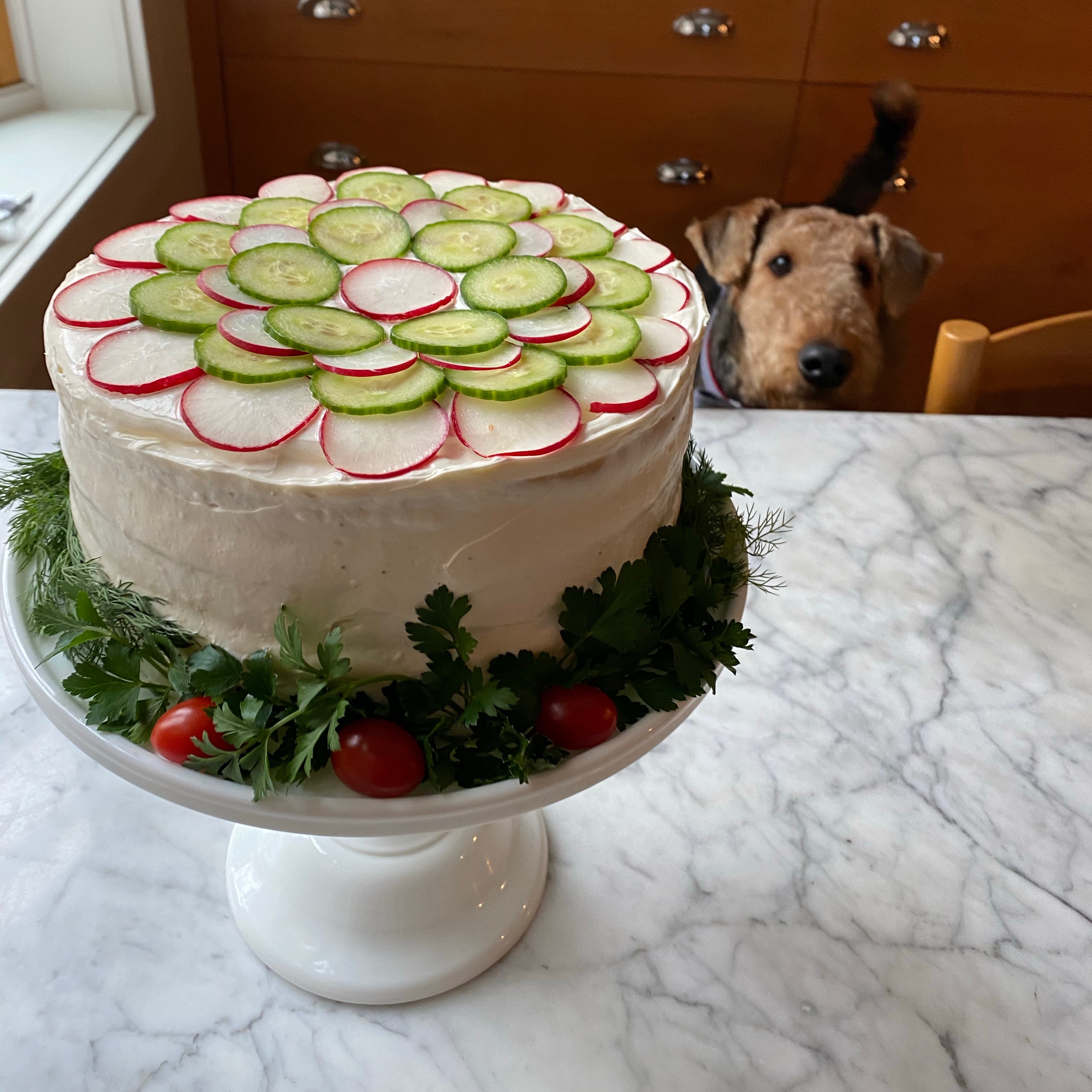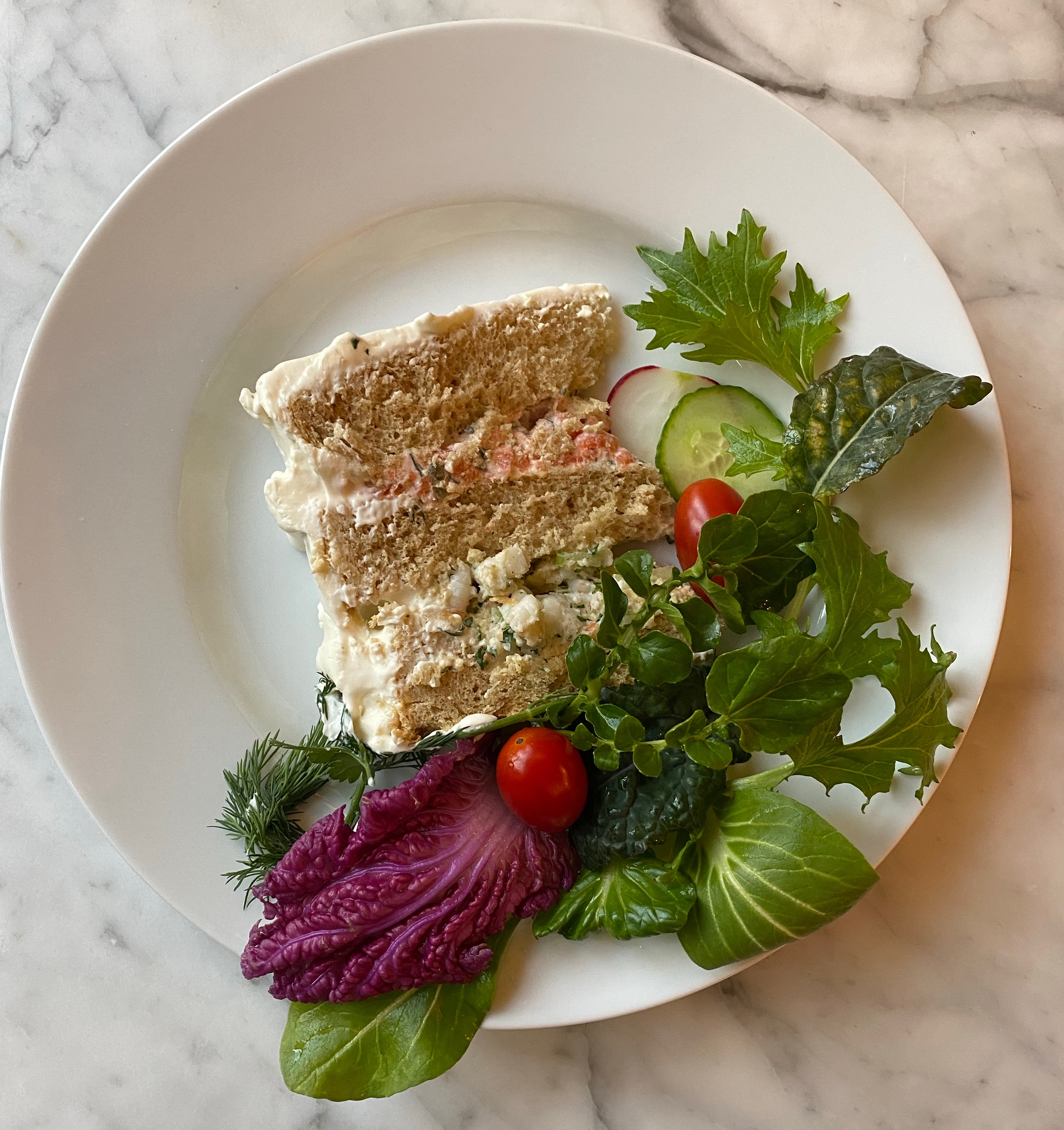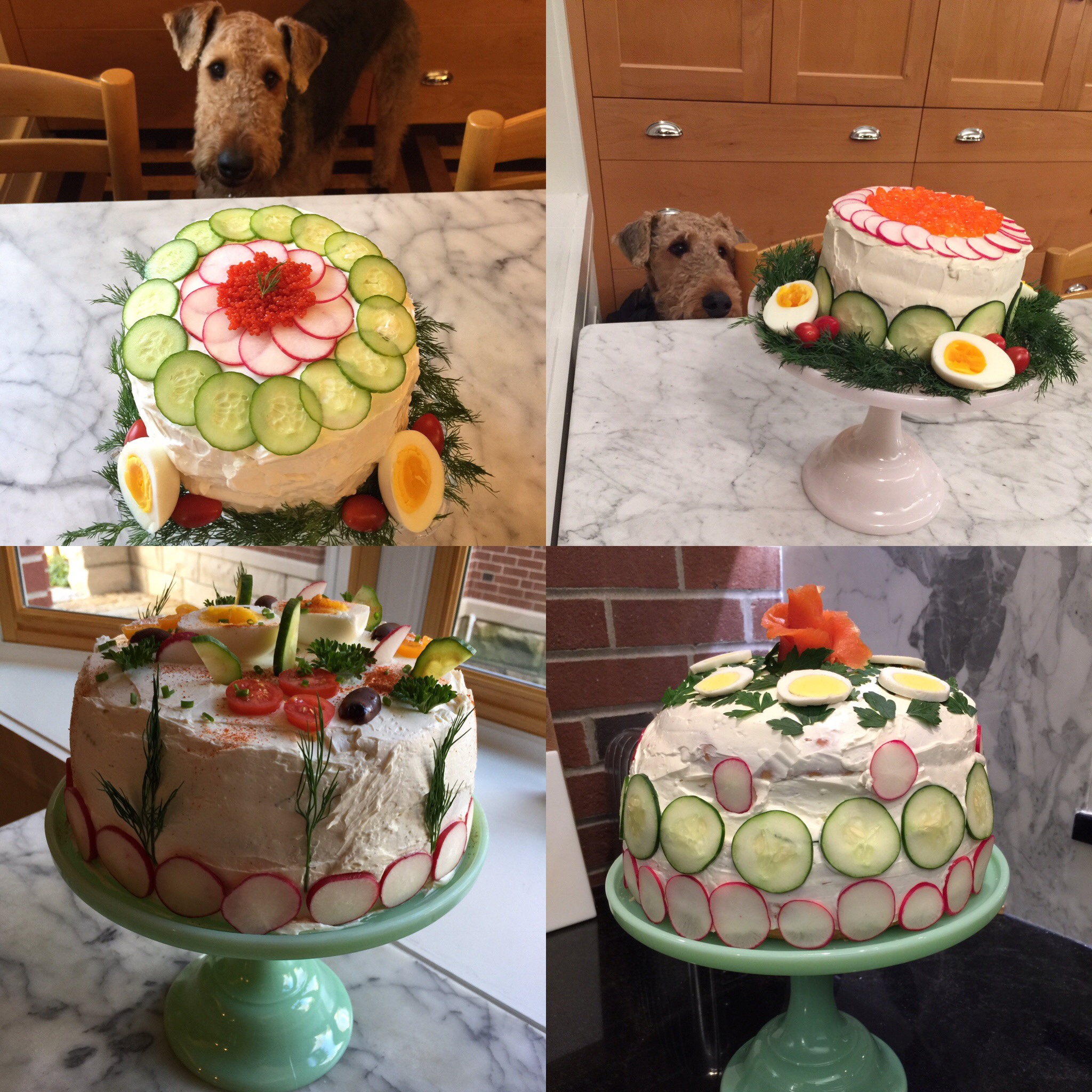 - To assemble: Slice the bread into 3 even slices horizontally. You may want to cut a bit of the top off to create nice even layers. Put the first layer on a dish. Spread mustard over the bread layer. Spread with an even inch covering of shrimp salad. Press the next bread layer down. Spread mustard over the bread. Spread an even layer of the salmon spread. Press the top bread layer down. Spread the cream cheese mixture over the tops and sides of the cake. Garnish with your choice of decorations such as salmon, shrimp, egg, radish, parsley, caviar etc. Sandwich cake benefits from a couple of hours in the fridge before serving. Great paired with a salad and some sparkling wine.